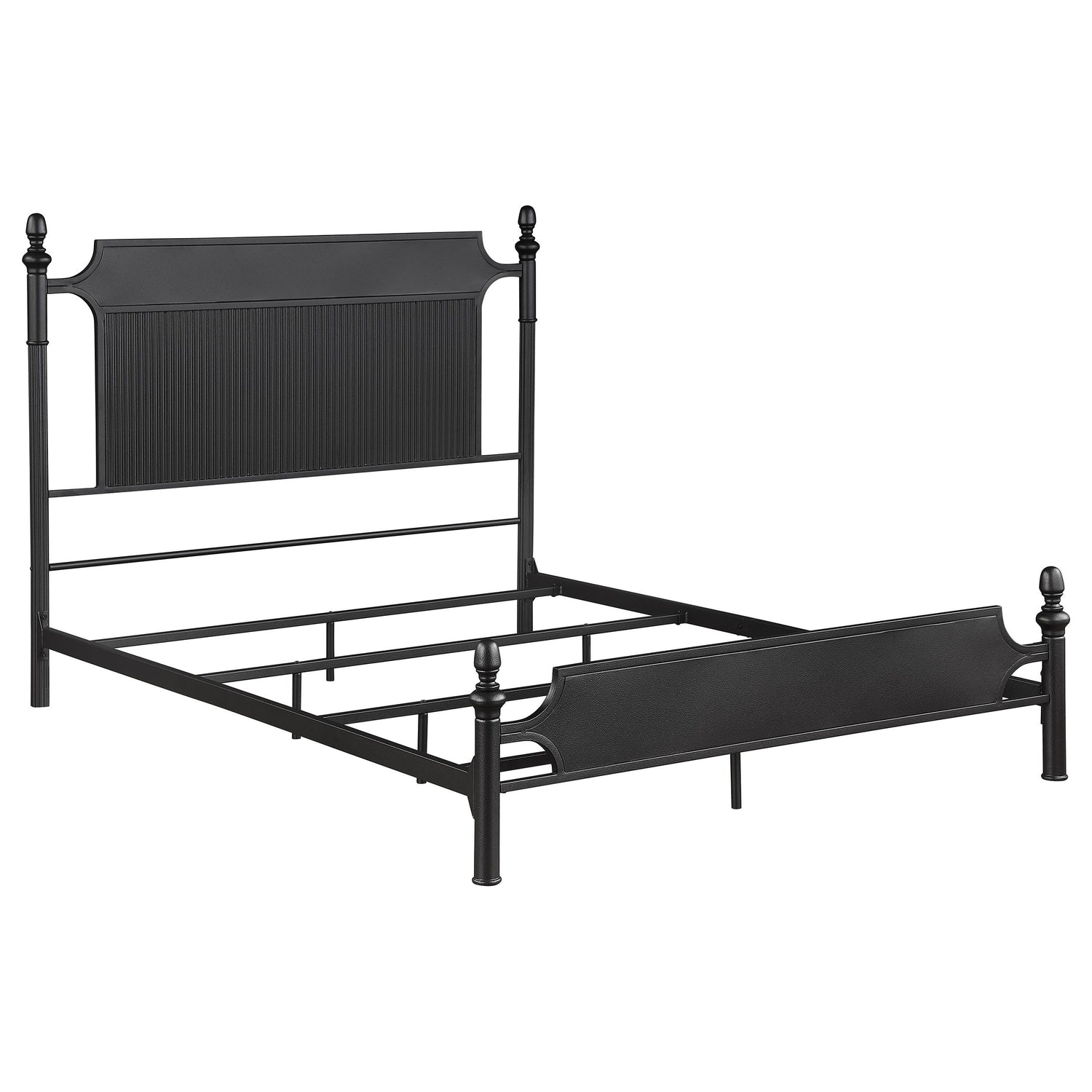 This is a metal bed frame featuring a classic and timeless design. The bed includes both a headboard and footboard, each adorned with turned finial posts that add a touch of traditional elegance. The headboard showcases a vertical ribbed texture, providing visual interest and a subtle contrast against the smooth surfaces of the frame. The finish lends a sophisticated and versatile appeal, making it suitable for various bedroom styles, from traditional to industrial. The sturdy metal construction ensures durability and long-lasting support, while the open design maintains an airy, spacious feel in the room.