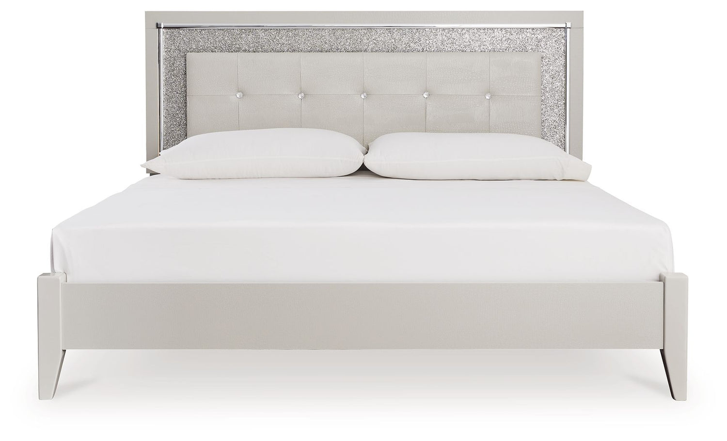 Bright, bold luxury. This king upholstered bed dazzles with its attention to detail. Your love of glamorous style is reflected in the tufted upholstery with faux alligator effect, exquisitely paired with faceted chrome-tone and glittery details. Complete with LED lighting around the headboard, it inspires you to live luxuriously every day—from waking up to reading before bed.