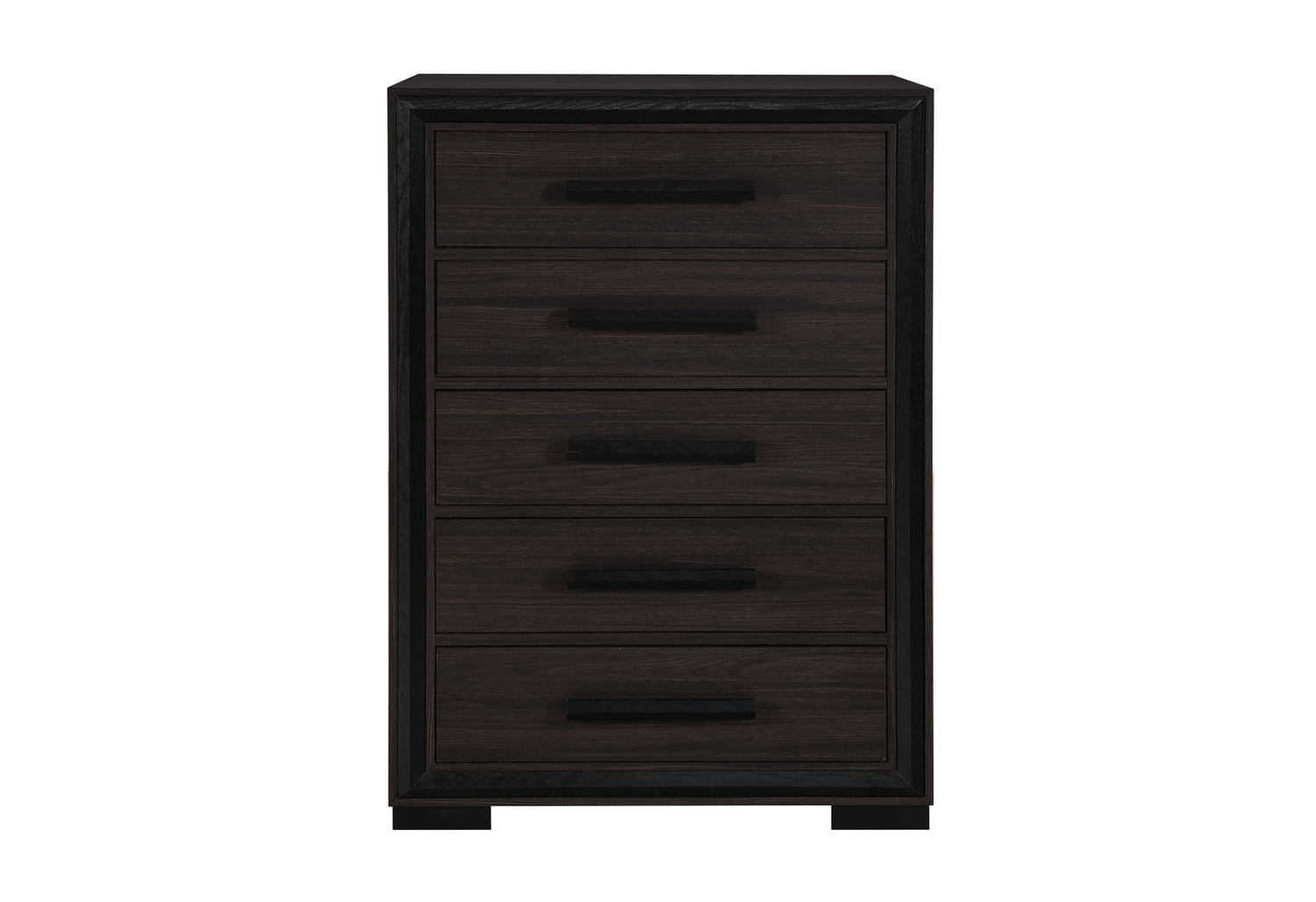 The Amelia Chest by Global Furniture USA epitomizes vertical storage sophistication. This tall chest is a space-saving marvel, offering generous storage within its drawers without sacrificing style. Like the other pieces in the collection, it features the eye-catching brown finish and black accent trim that define the Amelia line. The sleek black drawer pulls ensure seamless operation and contribute to the chest's sleek appearance. Whether storing sweaters, linens, or accessories, the Amelia Chest is an ideal solution for maintaining an organized and elegant bedroom.