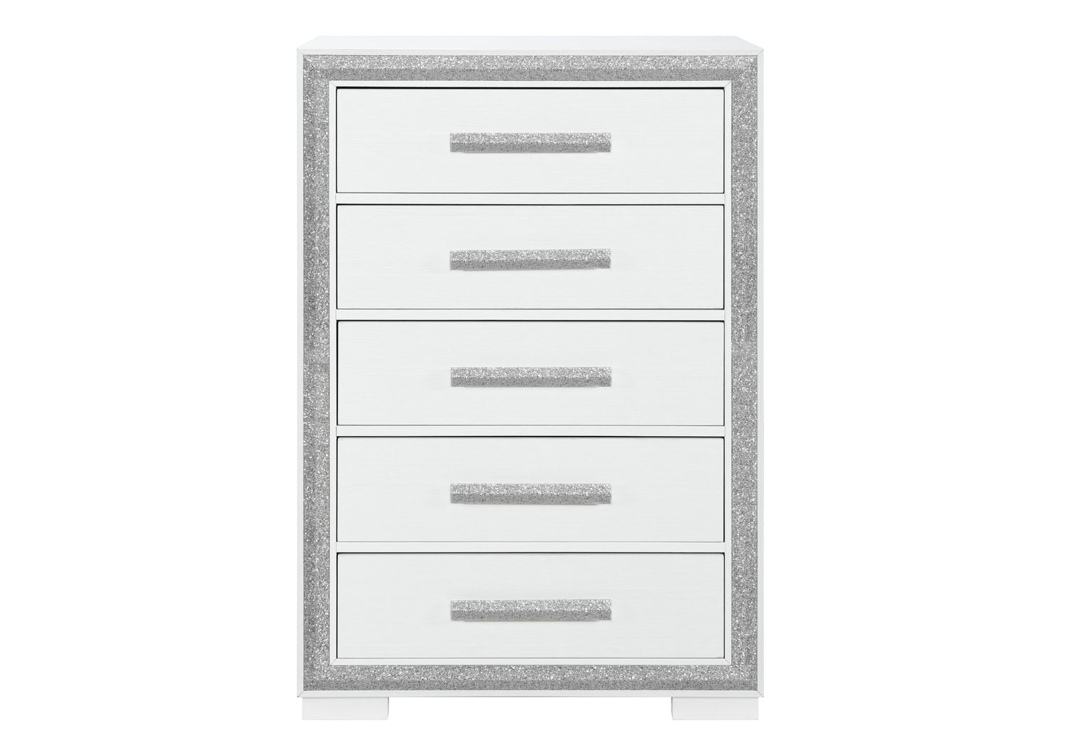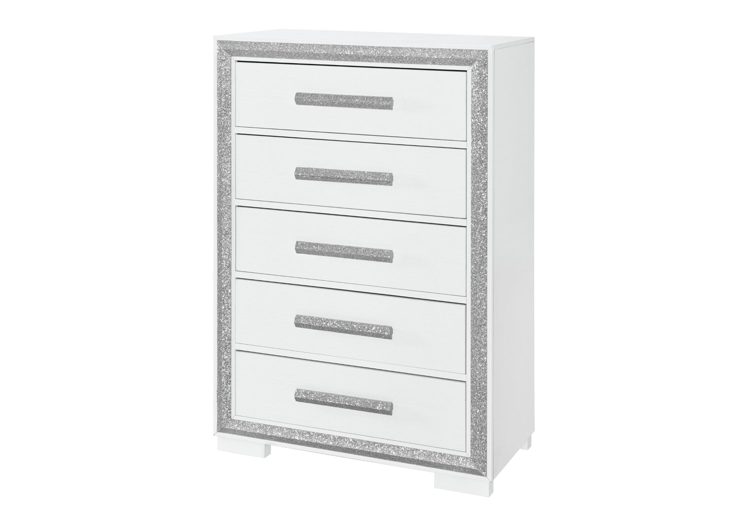 Maximize your bedroom's storage space with the stylish Andros Chest by Global Furniture USA. This chest shares the same sophisticated white finish and silver glam accent trim as the rest of the Andros collection, ensuring a harmonious design flow. The vertical structure offers a space-saving solution while providing ample storage with multiple drawers for organizing your clothing and accessories. The sleek glam drawer pulls are not only practical but also contribute to the chest's modern charm, making it an indispensable addition to your Andros Bedroom Collection.