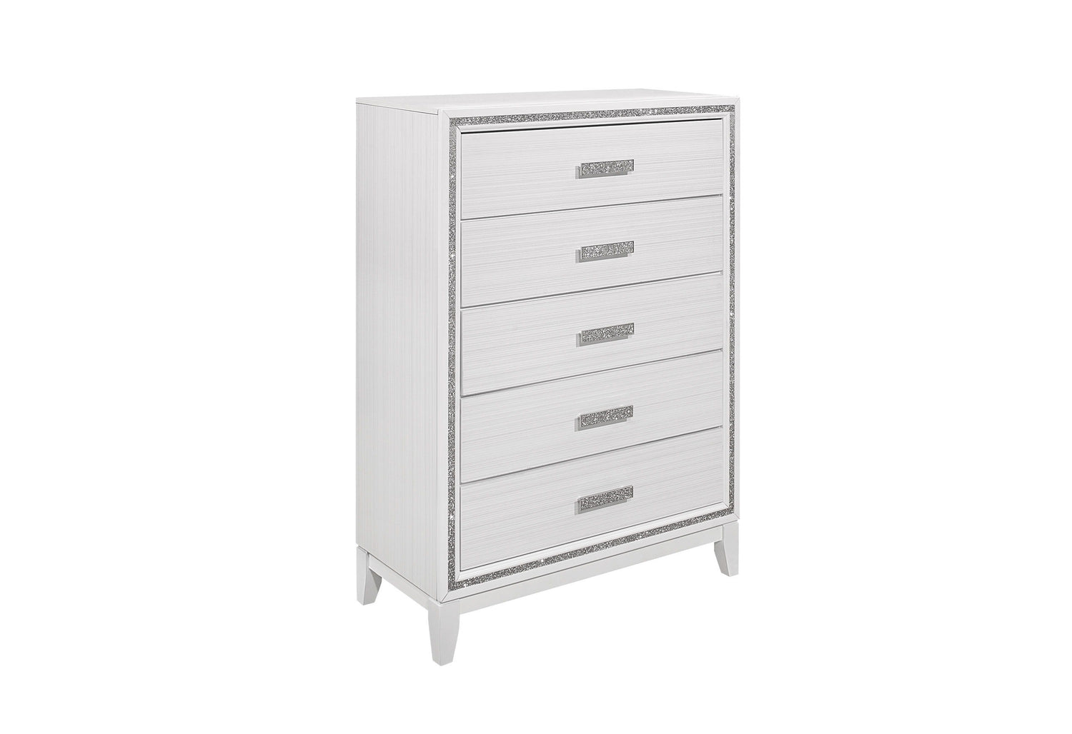 Lily bedroom brings two worlds together. The classic lines and modern accents create a beautiful transitional glam bedroom look. The crushed crystal like look outlines all the pieces along with LED lighting accenting the head board. The crushed crystal like design is not only used as an accent trim but is also carried over to the hardware. The end result is a beautiful glam bedroom.