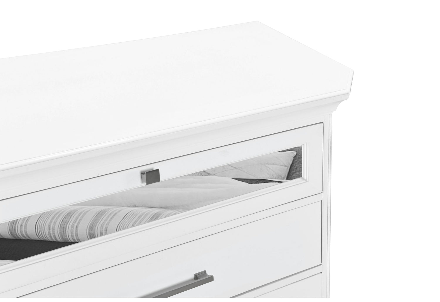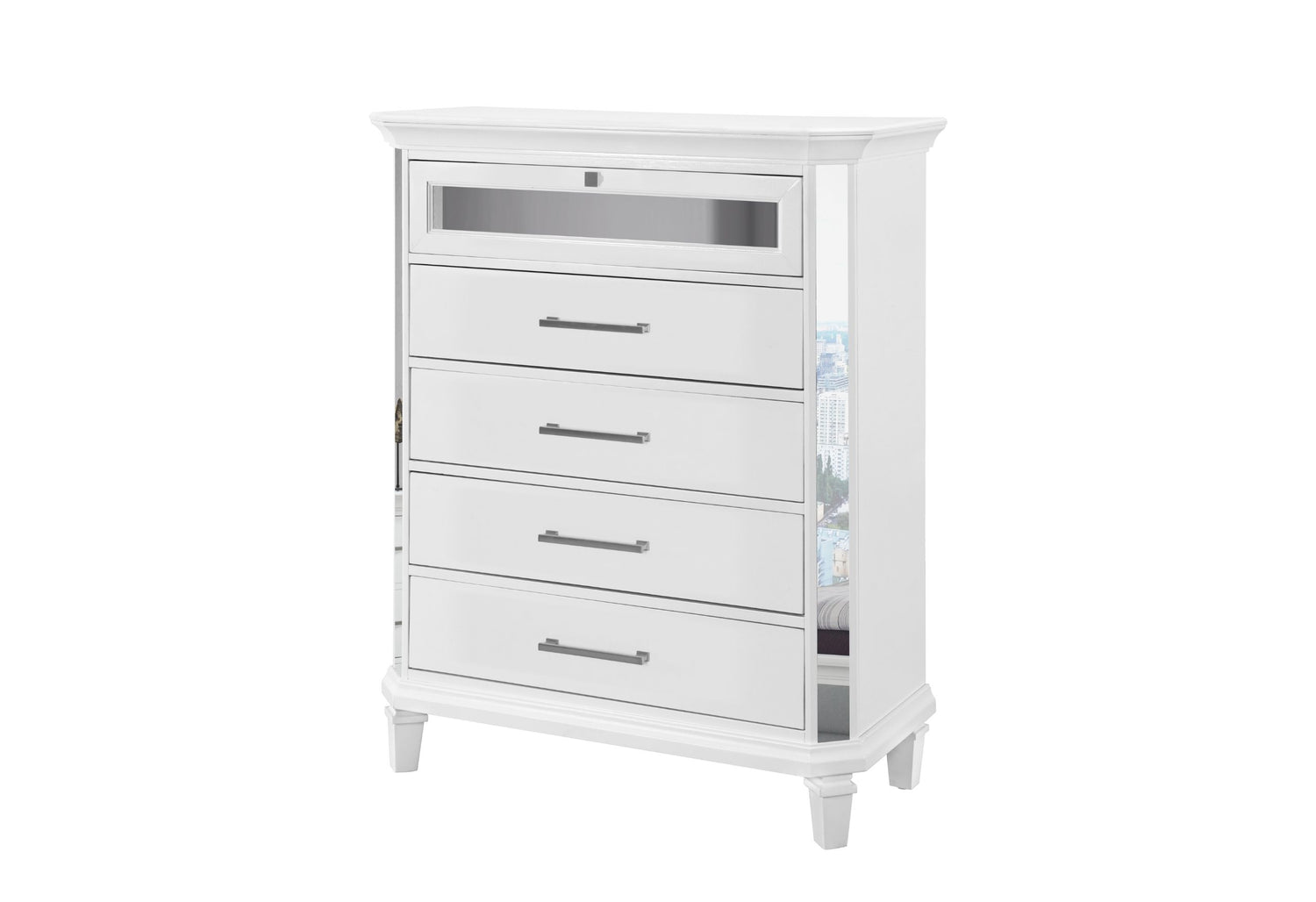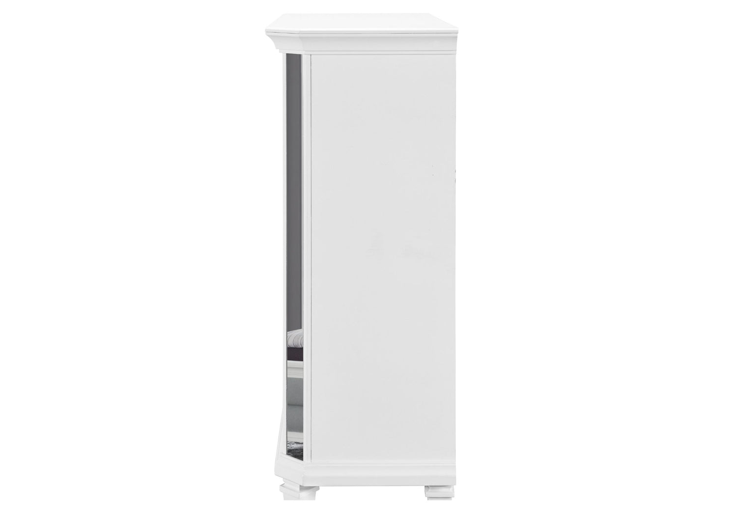 Complete your bedroom with the Marco Chest, a vertical storage option that shines in metallic white and mirrored detailing. Its contemporary design is both elegant and practical, providing ample space to organize your wardrobe essentials.