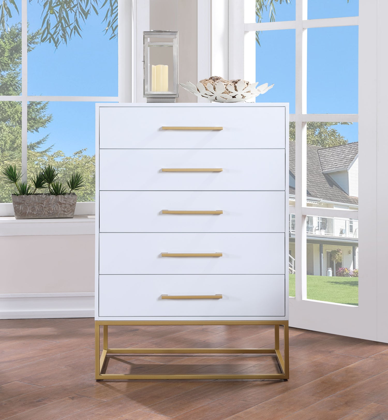 Inject bold, modern styling into your bedroom with this Maxine chest. The chest's contemporary design is nothing short of stunning, with unassuming lines and eye-grabbing hardware. A rich finish is modish and up-to-the-minute, while the brushed metal legs and drawer handles give this unit added flair. A metal base raises the chest from the floor for a noticeably upscale vibe. Fill this chest's drawers with essentials for keeping your bedroom space clean and neat.