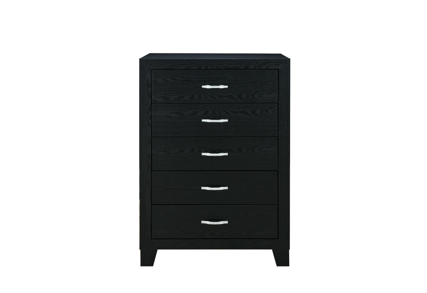 The Reid Chest from the Reid Bedroom Collection is a chic storage piece with a sleek black wood finish and glamorous hardware. This chest offers ample storage space while enhancing the modern aesthetic of your bedroom.