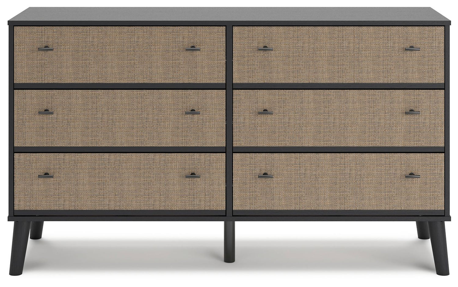 Put a retro spin on current trends with this dresser. Its mixed-material look of matte black and replicated beige cane brings a casually cool feel to your bedroom. Simple, sleek hardware and splay legs round out the urban meets mid-century vibe.
