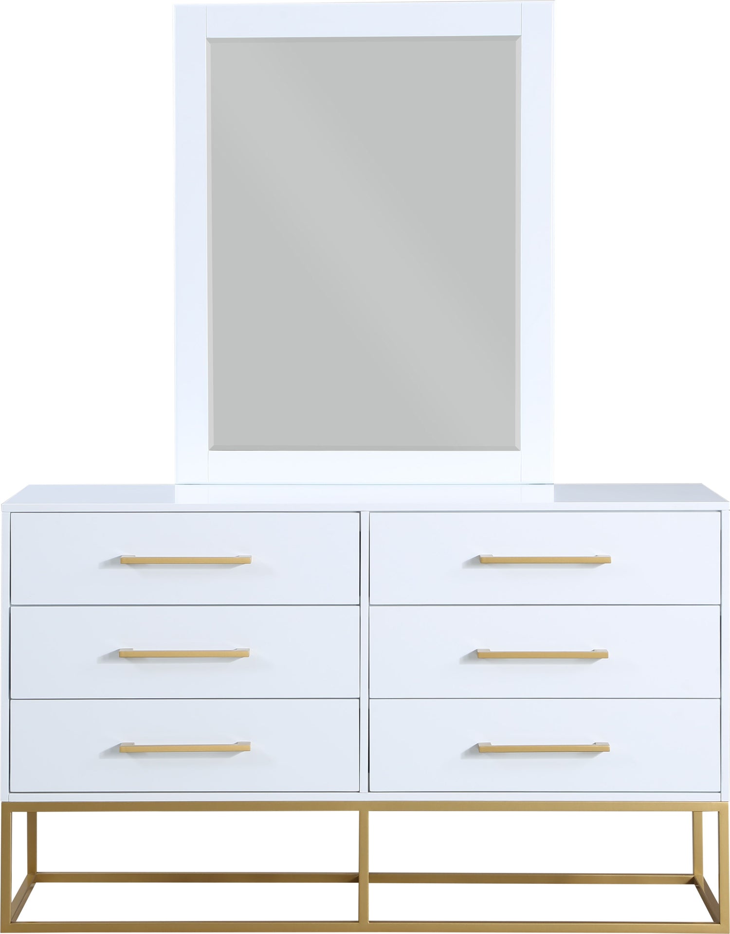 Inject bold, modern styling into your bedroom with this Maxine dresser. The dresser's contemporary design is nothing short of stunning, with unassuming lines and eye-grabbing hardware. A rich finish is modish and up-to-the-minute, while the brushed metal legs and drawer handles give this unit added flair. A metal base raises the dresser from the floor for a noticeably upscale vibe. Fill this dresser's drawers with essentials for keeping your bedroom space clean and neat.