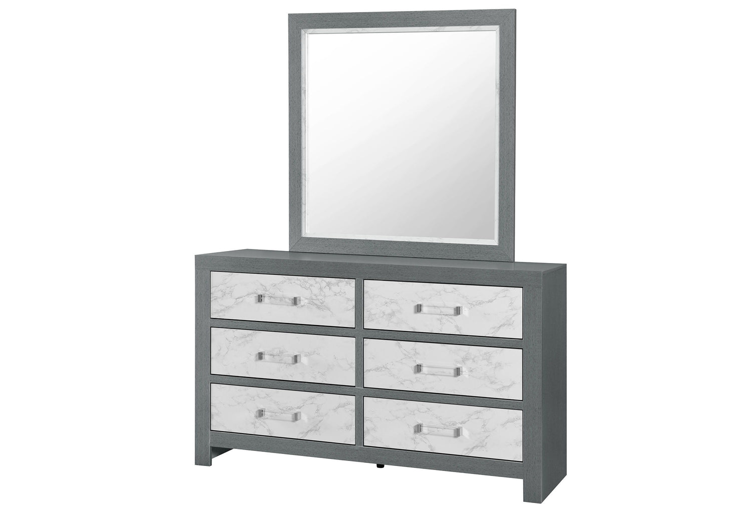 Crafted with sophistication and practicality in mind, the Micah Dresser is an essential addition to any bedroom. The dresser's faux marble drawer fronts are complemented by the gleaming silver finish, offering a luxe surface that is both eye-catching and serene. Acrylic and chrome drawer pulls accentuate its sleek design, providing easy access to the spacious drawers that glide smoothly for effortless organization. Whether displaying your favorite decor or storing your wardrobe, the Micah Dresser unites functionality with grandeur.