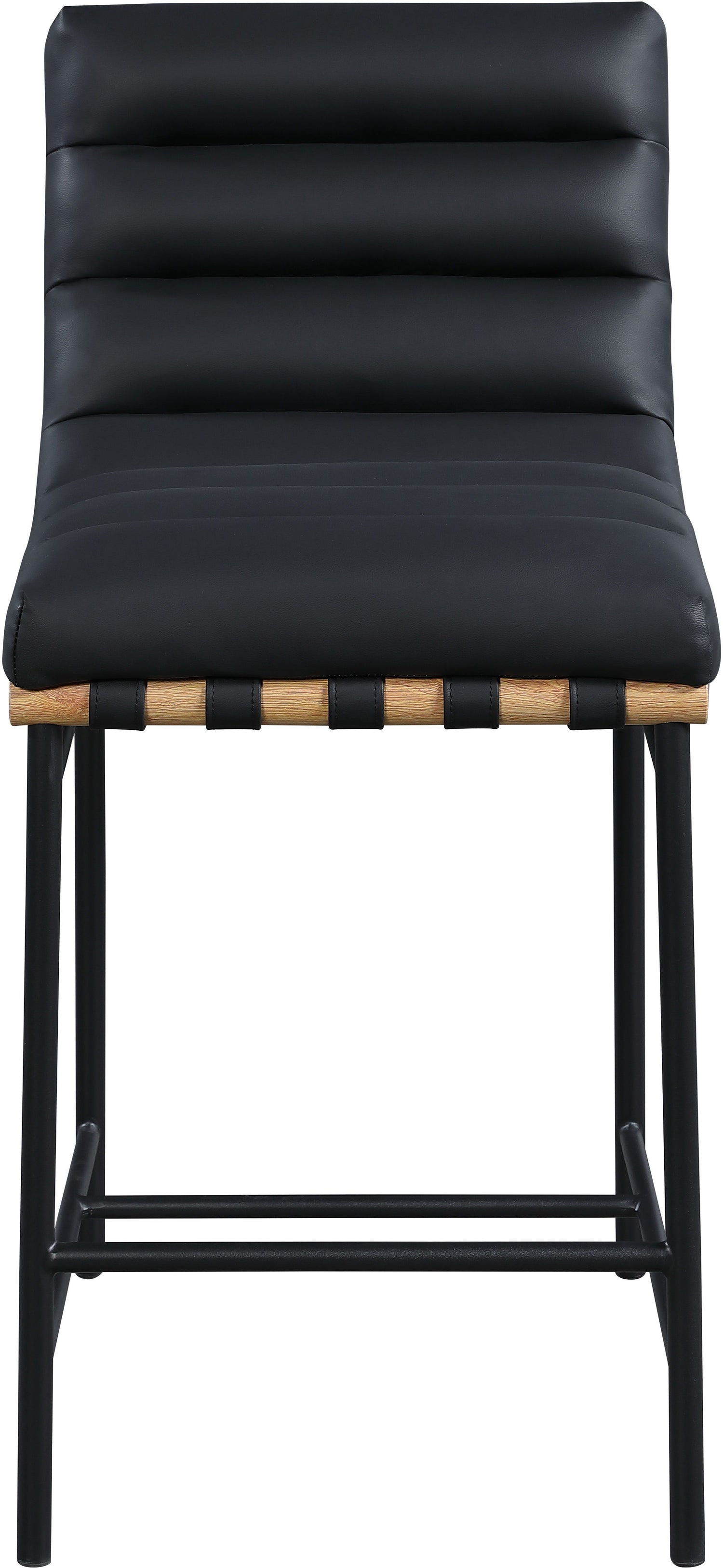 Kick back and relax with a drink in your hand with this Burke black faux leather counter stool. Featuring soft faux leather upholstery and faux leather straps, this counter stool is cozy and stylish. Its matte metal frame provides sturdy support so you can enjoy this stool for years to come. A white oak veneer metal dowel is tucked firmly in place beneath the front of the stool, providing extra support and added style.