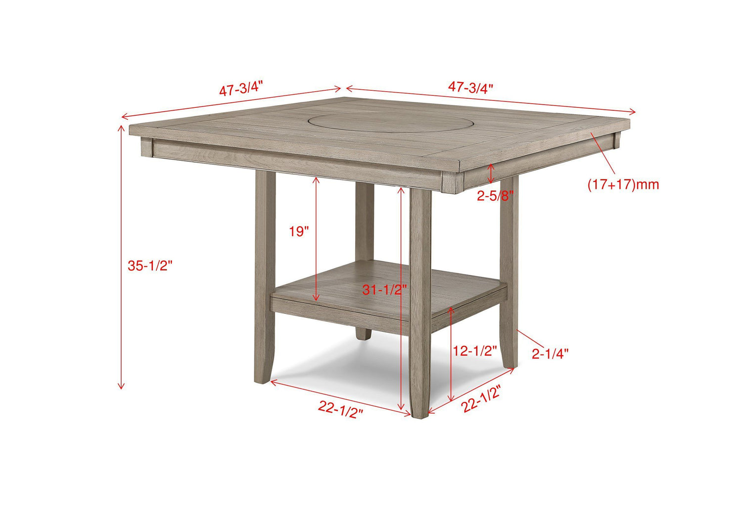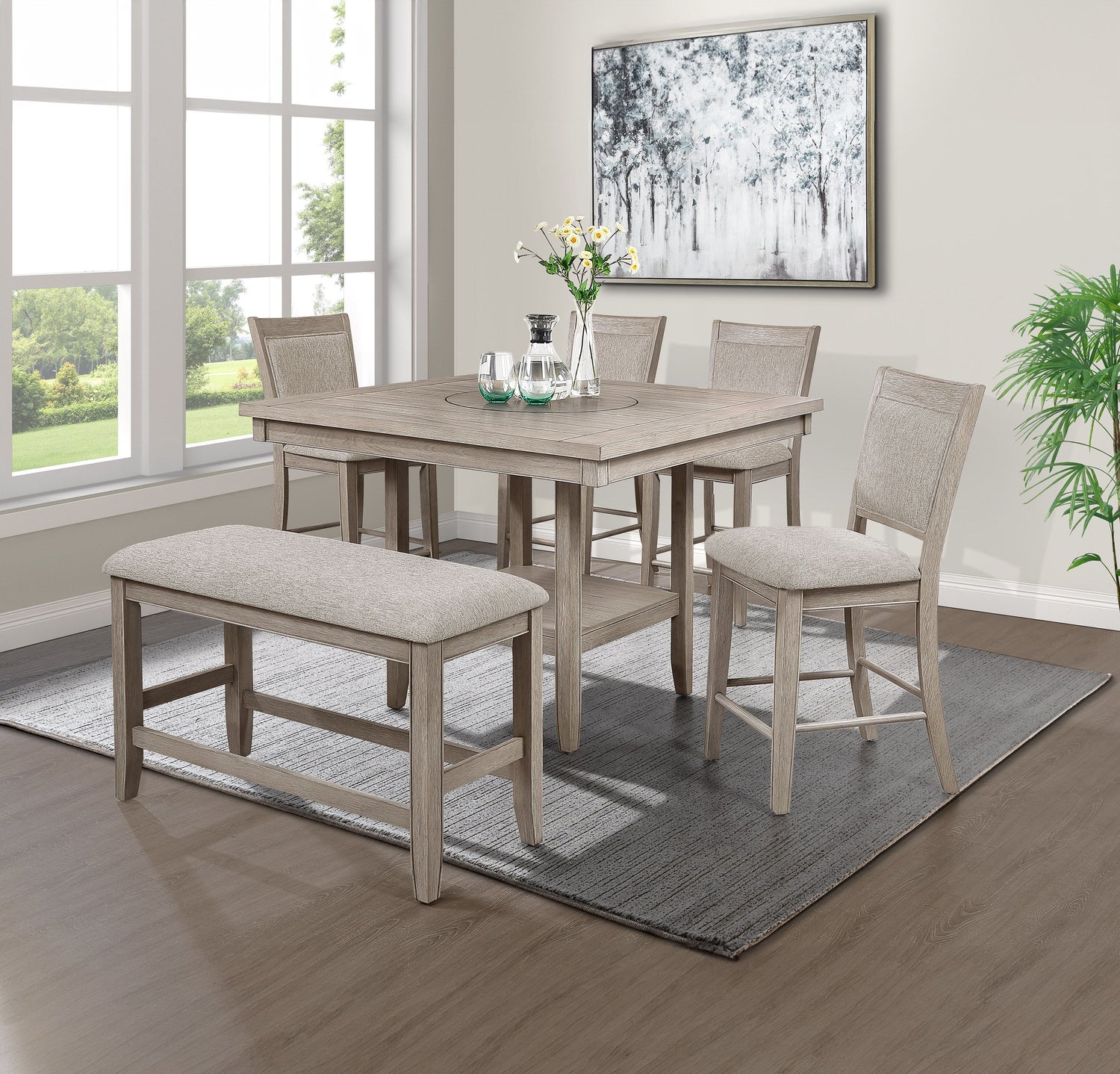 Elevate your dining experience with this elegant counter height dining set, designed to blend seamlessly with any modern or rustic décor. The set features a spacious, finely crafted table with a built-in turntable and open lower shelf in a weathered gray finish, exuding a timeless charm that enhances the warmth and appeal of your dining area. Complementing the table are four ergonomically designed chairs and a versatile bench, all upholstered in a soft, neutral fabric that promises comfort and durability. The sturdy wooden frames ensure lasting stability, while the bench adds a unique touch, perfect for family gatherings or casual dinners.