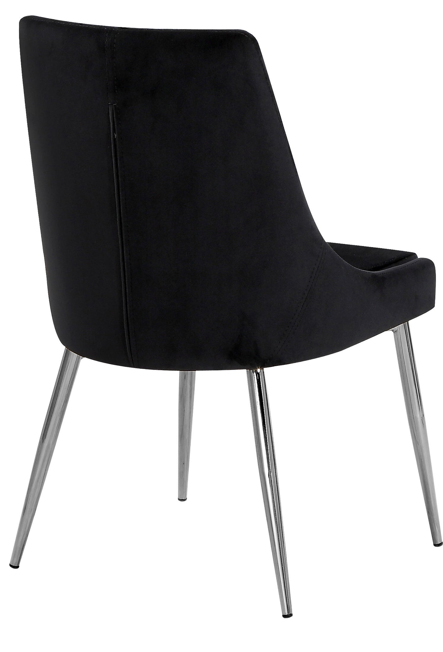 Extend contemporary panache to the dining room with this Karina Dining Chair. This dining chair features upholstery in sleek velvet for a modern look and has an armless design for a retro-inspired vibe. The stark color makes it easy to blend in with your existing decor colors or make a contrasting statement with ease. The slanted legs of this chair are finished for added modernity and to provide reliable and durable support while you dine.
