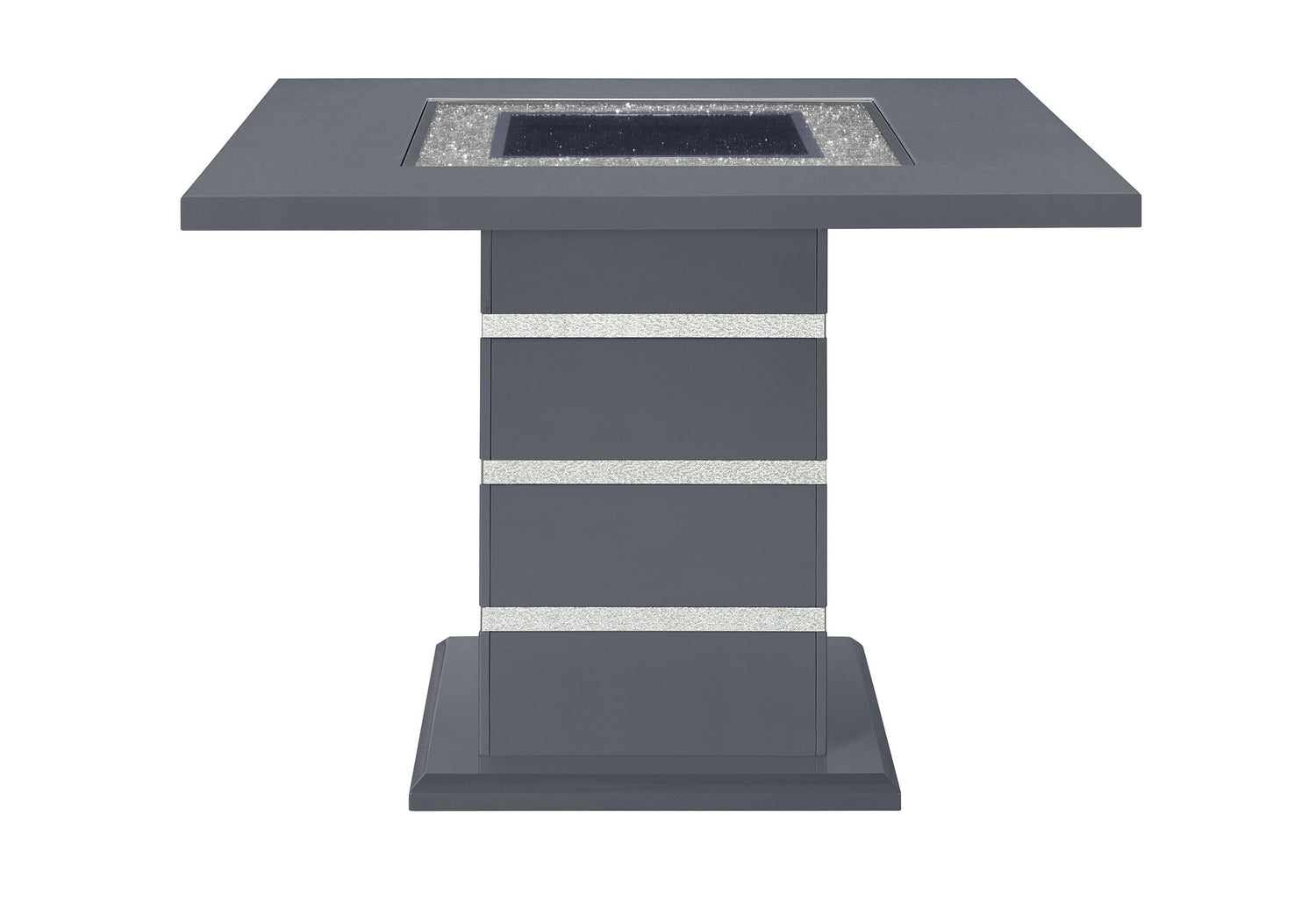 This bar table is a showcase example of how charm and a touch of elegance can dramatically change the look of your eating area. This table includes glitter detailing style elements with a sturdy construction and a high gloss finish with a clear glass inlay to round off the look. Constructed of MDF, Glass and Acrylic this dining table makes a bold statement. Finished in a Dark Grey and Silver with a center glass, rectangle shape and pedestal base you will have more than enough room to entertain and enjoy your dining experience.