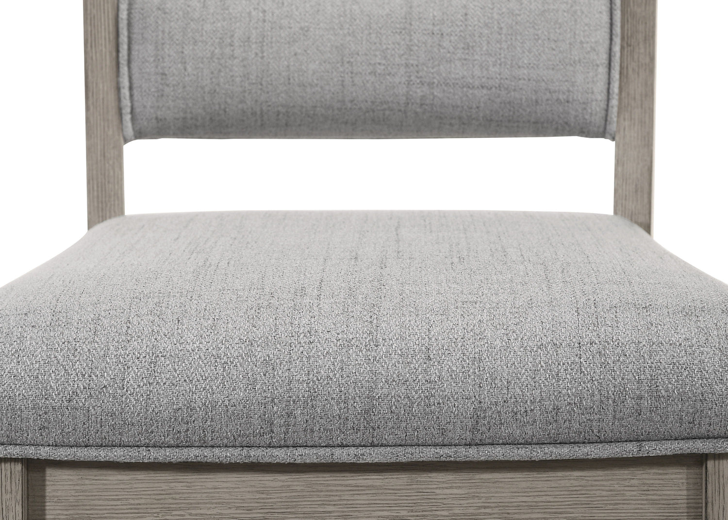 This dining set exudes modern elegance with its counter-height design and a soft grey finish that beautifully complements any contemporary decor. The set features a sturdy, expandable square table that balances clean lines with a rustic wood grain texture, providing a casual yet refined look. Accompanying the table are comfortably upholstered high-back chairs and a matching bench, both enhancing the aesthetic with their light fabric that contrasts the wood's muted tones.