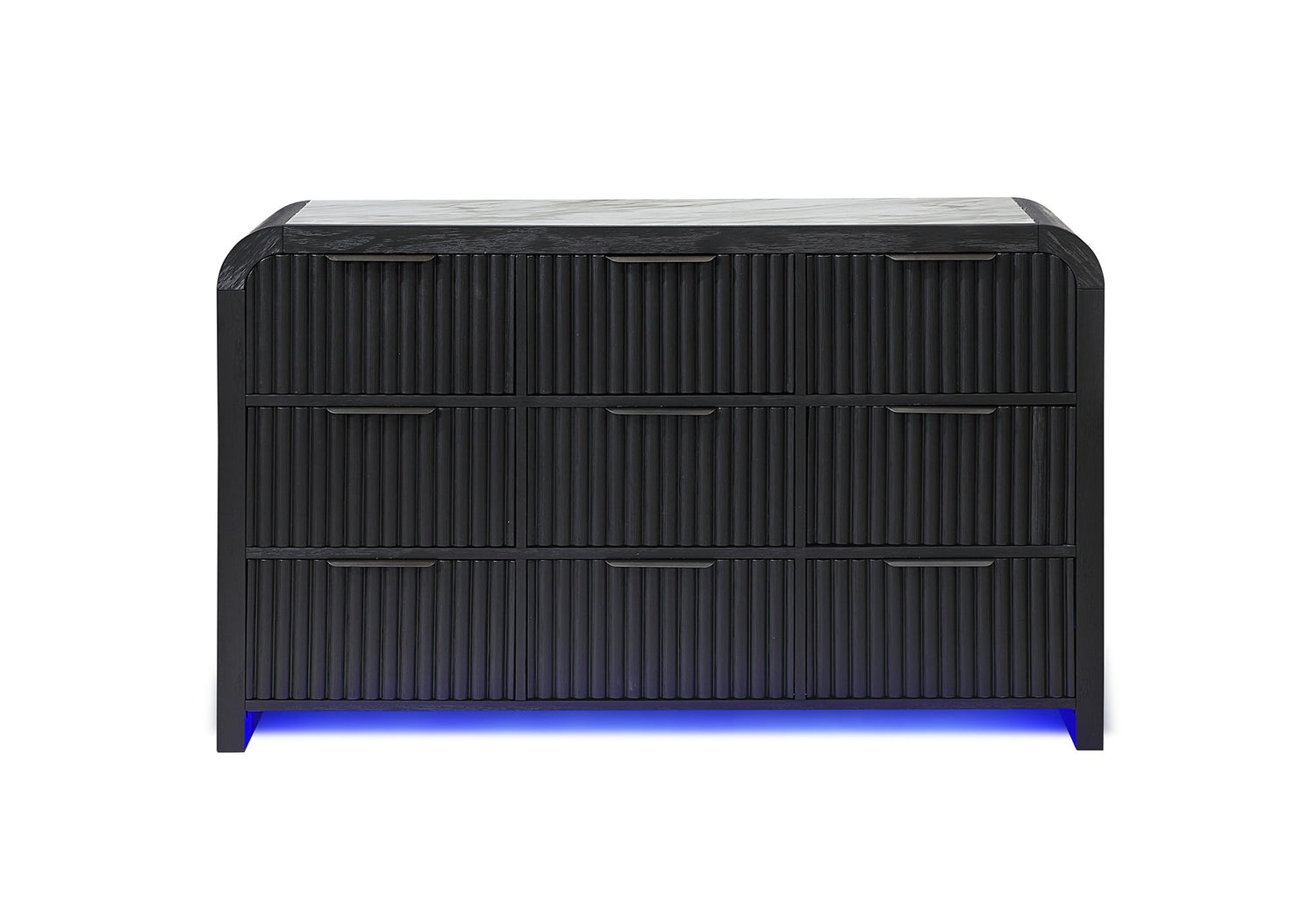 The Beckett Dresser features a black finish, white faux marble top, and drawer fronts with elegant, fluted detailing for a sophisticated, textural appeal. Built-in LED lighting adds a modern glow, while the spacious drawers provide ample storage. This piece perfectly balances style and functionality.