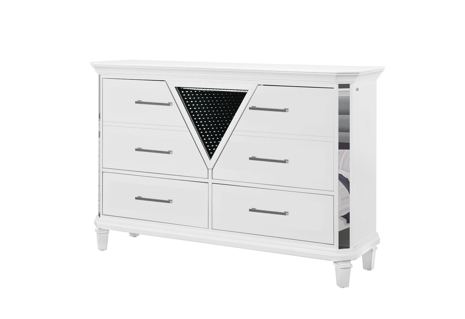 The Marco Dresser combines functionality with chic design, featuring a sleek metallic white finish complemented by mirrored accents. The infinity LED accent adds an enchanting glow, making this dresser not just a storage solution, but a statement piece.