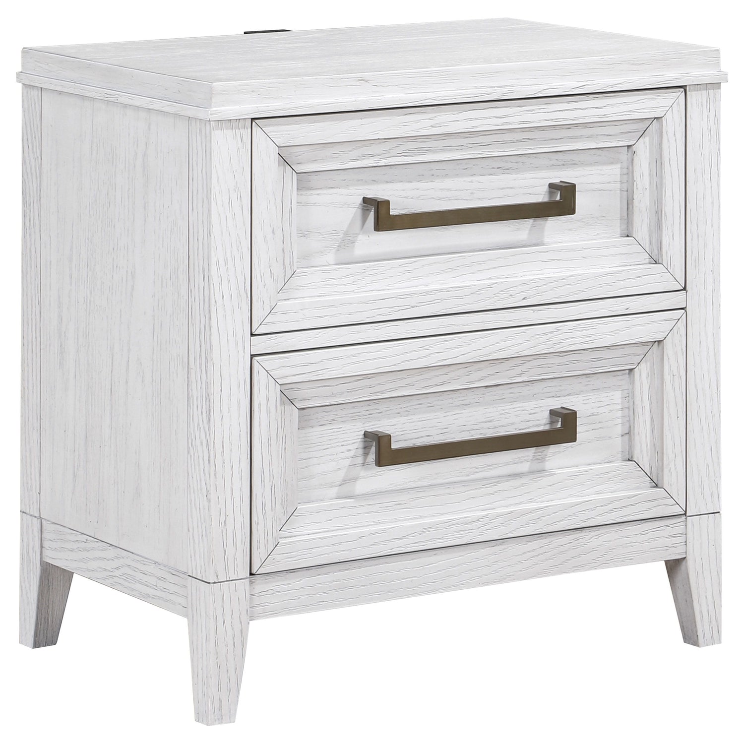 Bring fresh perspective to your bedside with a modern two-drawer nightstand. Its casual style and classic stance create a restrained look and feel, perfect for a soothing bedroom space. It features a distressed white finish over wood grain, creating subtle depth and detail. Drawers are roomy for bedside essentials, and stepped fronts add character and dimensionality. Contrasting antique brass toned bar pull complete the look, offering stylish allure in your stylish bedroom.