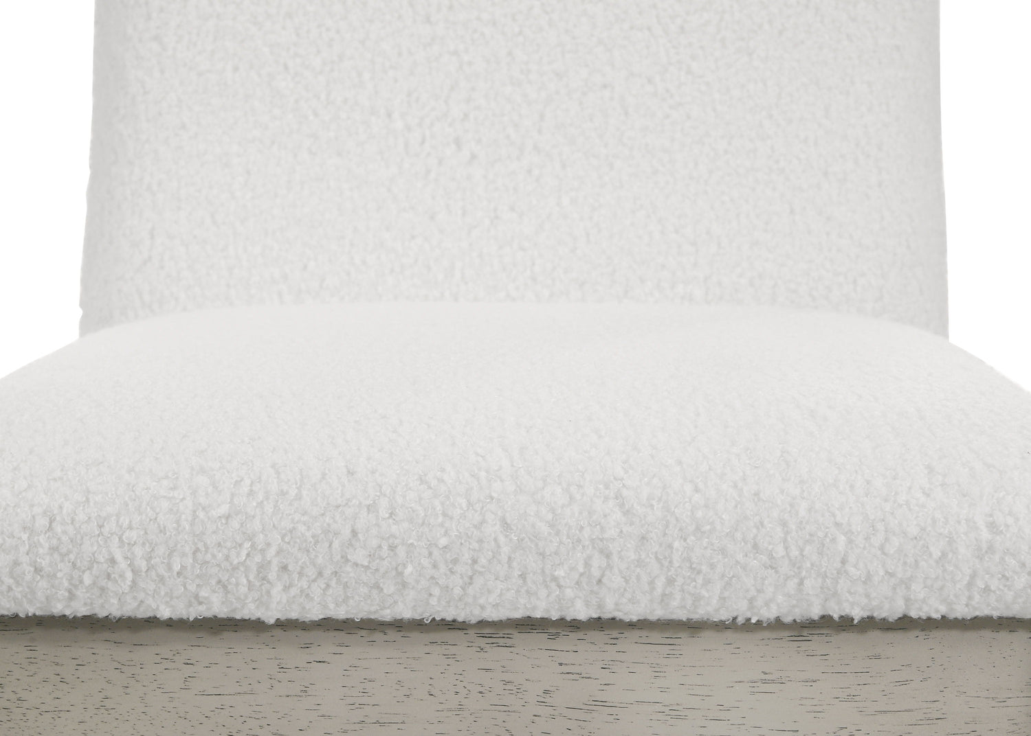 Introducing a dining set that seamlessly blends minimalism with contemporary elegance. Anchoring the ensemble is a robust table featuring a muted, natural finish that highlights the woodgrain detail. Accompanied by sleek chairs upholstered in a plush, boucle fabric, the ensemble promises unparalleled comfort without compromising on style.