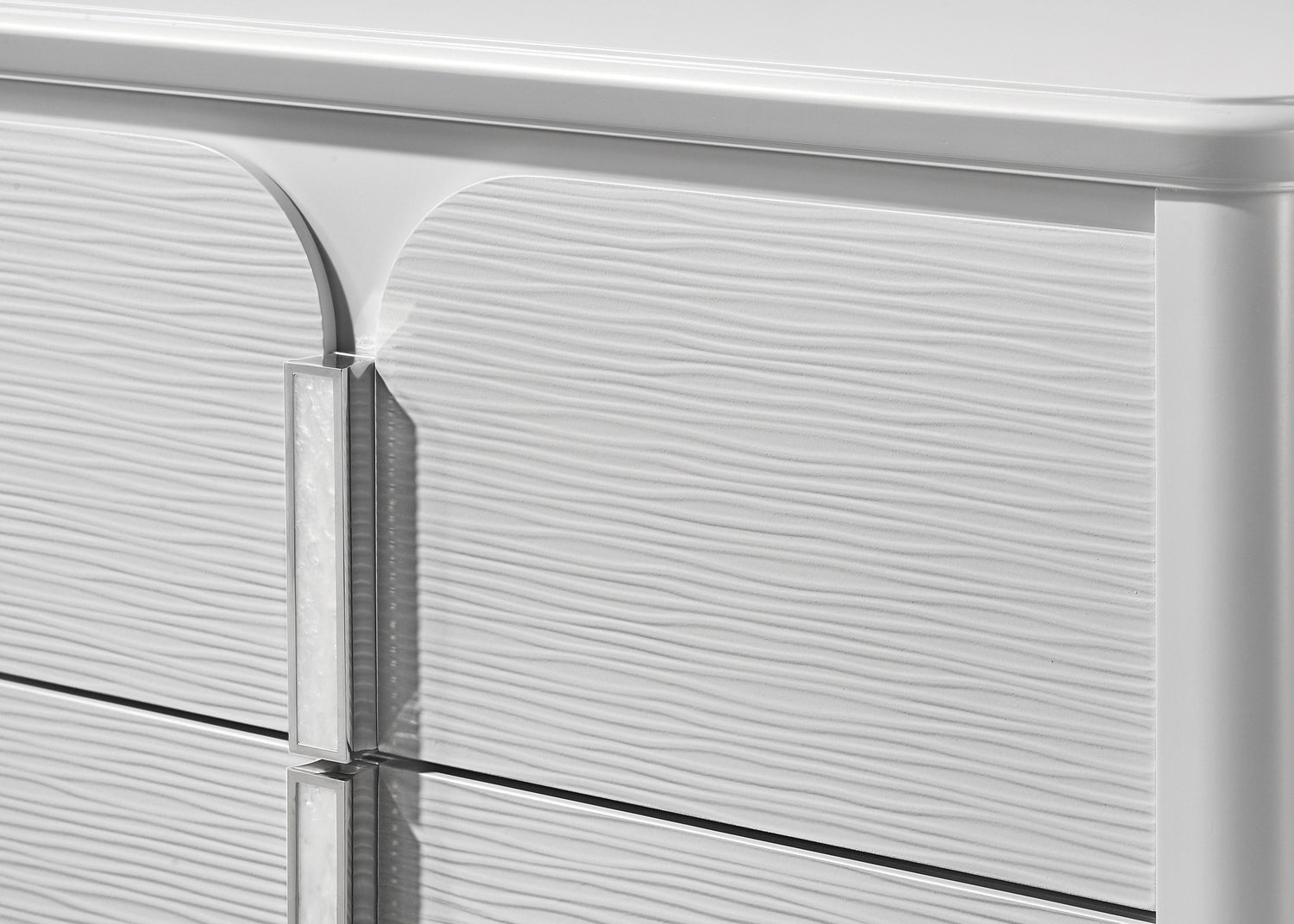 Dive into the luxurious embrace of this chic and polished bedroom collection, where contemporary design meets comfort in a symphony of elegance. At the heart lies a sumptuous bed with a plush, padded headboard with integrated lighting, inviting you to recline in style, while the crisp white and subtle silver tones of the accompanying pieces radiate a serene opulence. Each piece, from the sleek dresser with its refined backlit mirror to the stately chest and convenient nightstands, is crafted with a textured finish, adding depth and interest to the clean, modern lines. The collection's acrylic accents and discreet metal trimmings reflect a minimalist sensibility with a touch of glamour, turning your bedroom into a sophisticated retreat.