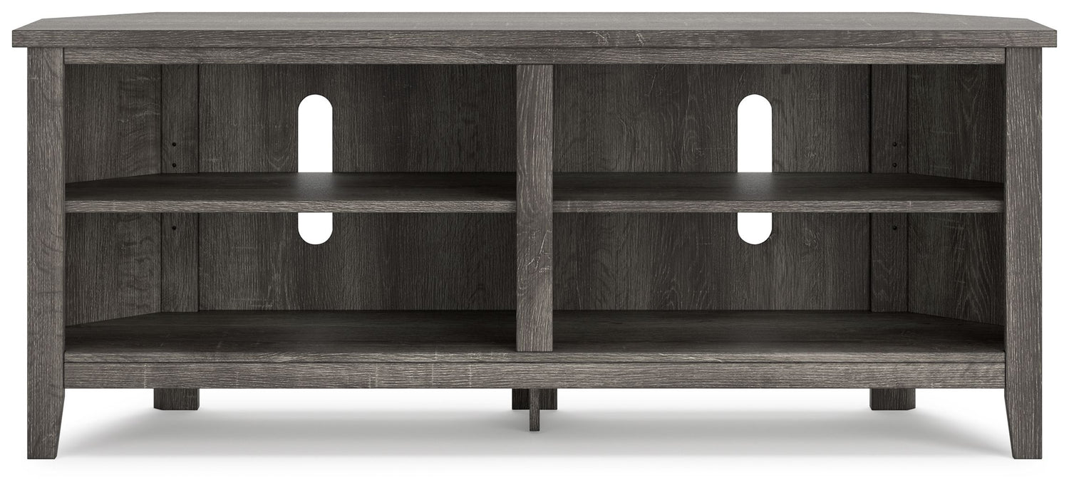 With its replicated weathered oak finish and authentic charm, this corner TV stand is right in tune with your relaxed approach to high style. Beautifully shaped to nestle into any corner, it’s well equipped with shelving and cutouts for wire management. What a mastery in modern farmhouse living for small spaces.