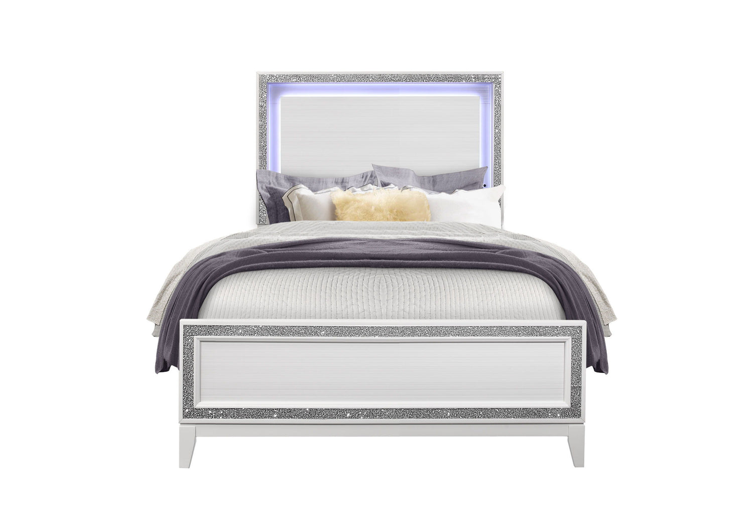 Lily bedroom brings two worlds together. The classic lines and modern accents create a beautiful transitional glam bedroom look. The crushed crystal like look outlines all the pieces along with LED lighting accenting the head board. The crushed crystal like design is not only used as an accent trim but is also carried over to the hardware. The end result is a beautiful glam bedroom.