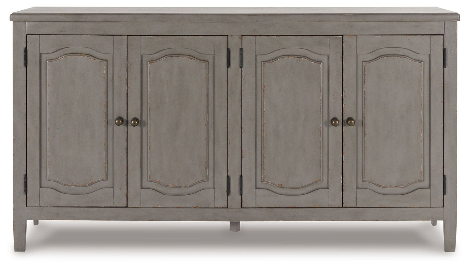 Put your love of European farmhouse styling on display. Finished with an antiqued gray chipped paint effect for an authentic vintage look, this accent cabinet is loaded with character. A pair of spacious double-door cabinets with an adjustable shelf provide plenty of storage for linens, dishes, glassware and more.