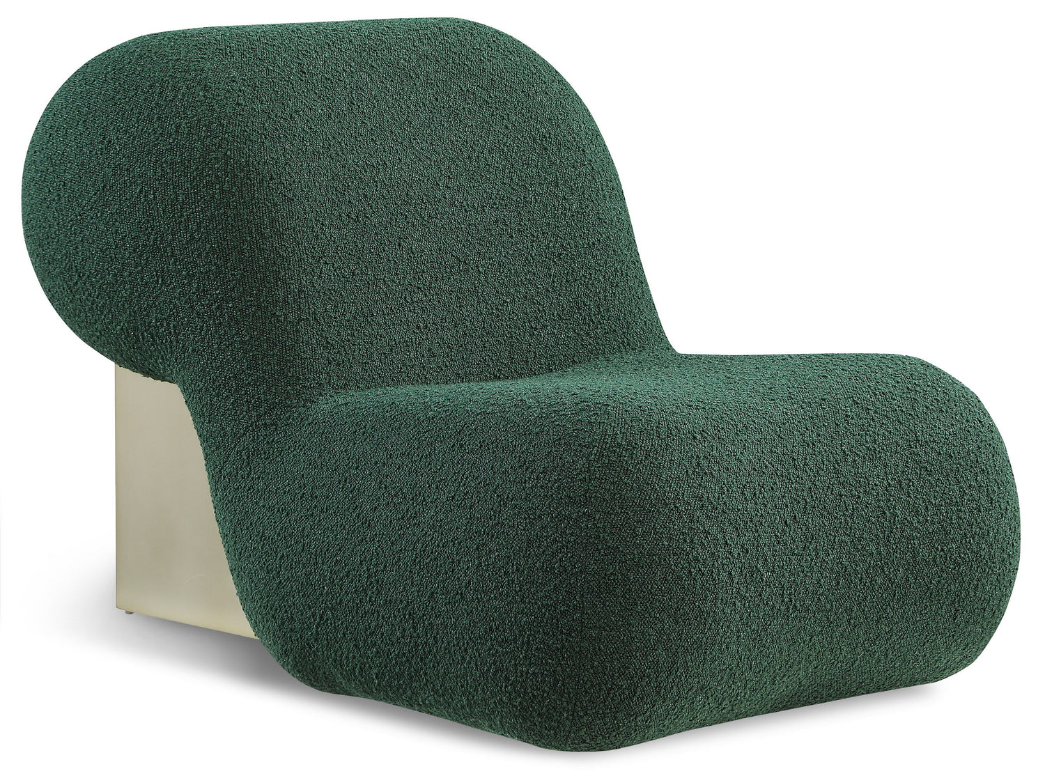 Lounge the day away from the comfort of this green Quadra boucle fabric accent chair. Perfect to set a casual vibe in any room, this accent chair offers a slanted back to help you position yourself comfortably for an evening of binge watching your favorite programs. An iron metal frame ensures long-lasting performance, while a rich green teddy fabric upholstery adds welcoming softness.