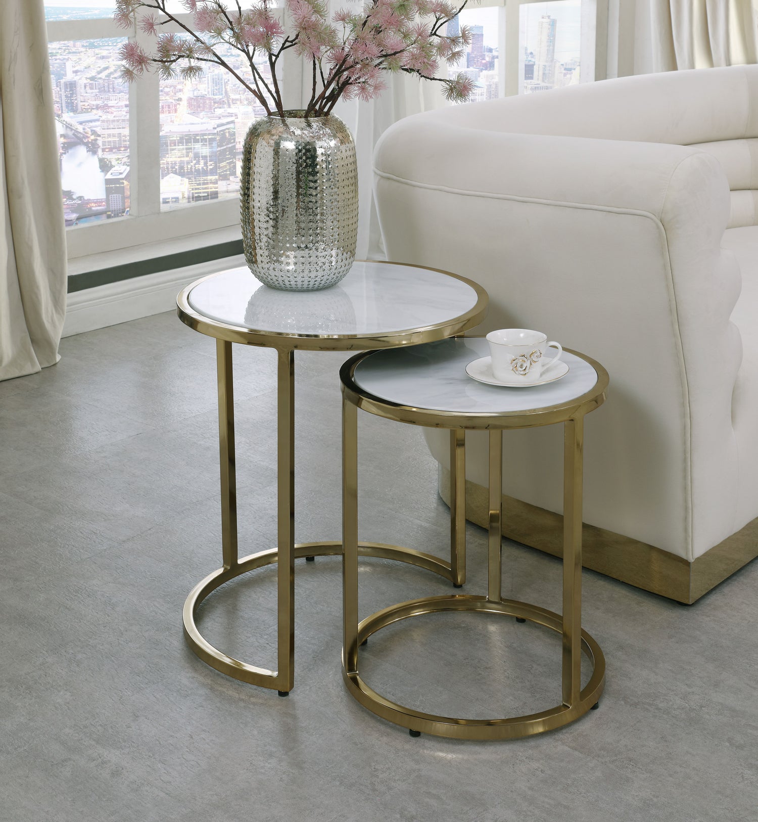 Double your end table space with this Massimo Nesting table Set. These two tables mesh together to save space, or pull out the lower table to increase your coffee table real estate. The faux marble neatly matches the gold steel legs. The gold also gives the table tops a beautiful curved edge for contemporary style. Both tables can be used independently of each other, so that you can place one at each end of your room.