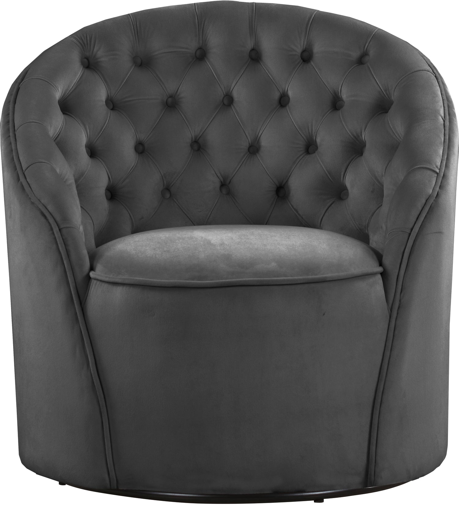 Give your living space a sophisticated makeover with this Alessio Accent Chair from Meridian Furniture. This swivel base accent chair has luxurious velvet upholstery that provides you with a soft, comfortable place to sit while you cozy up with your favorite book or curl up in front of your favorite TV show or movie. Deep button tufting on the inner back adds to its contemporary design, making it the perfect addition to any room in your home.