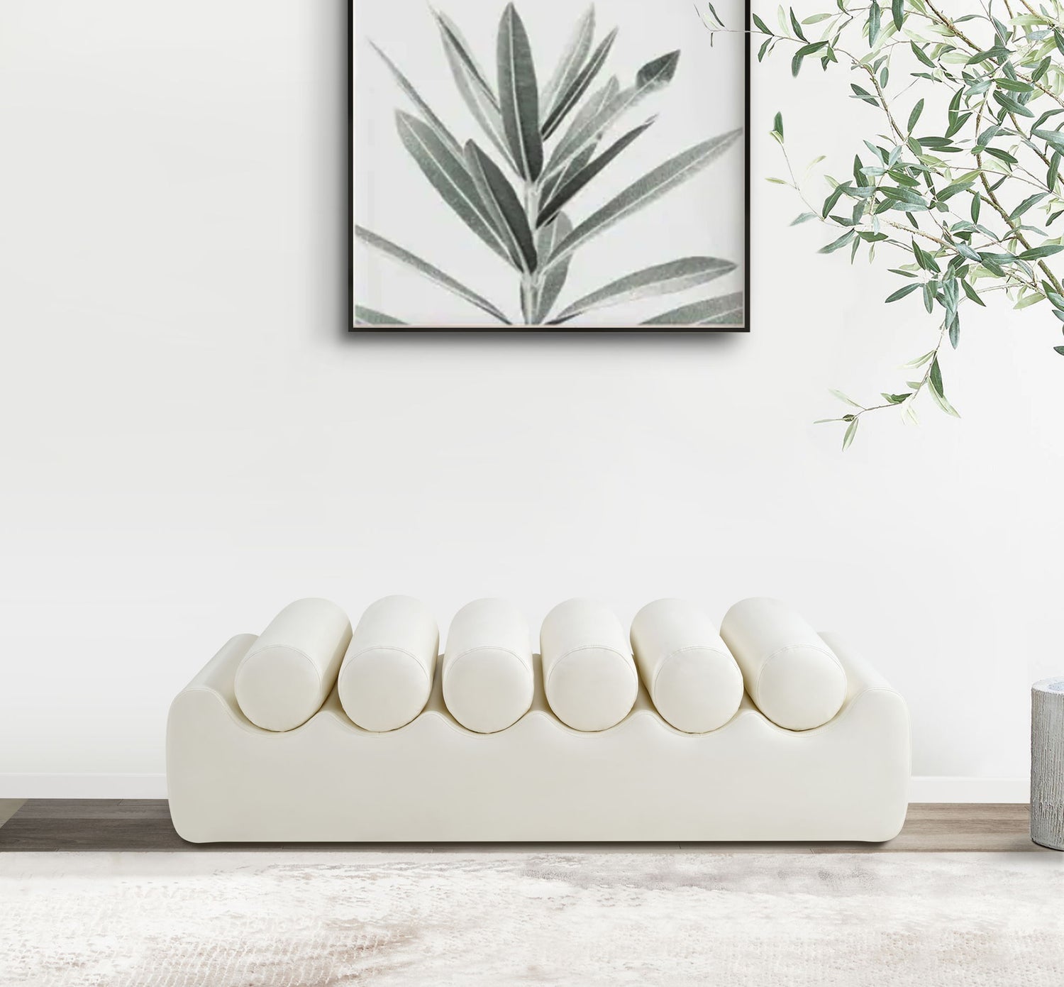 Discover the Rumble vegan leather bench, featuring a sleek, soft feel that adds a touch of contemporary elegance to any room. This stylish bench offers three removable bolster pillow seats for enhanced comfort and versatility. Its modern design seamlessly blends with various decor styles, making it a versatile choice for your entryway, living room, or bedroom.
