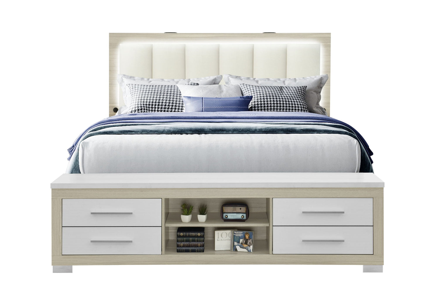 Transform your bedroom into a modern retreat with the Madison Natural and White Bedroom Collection by Global Furniture. This collection combines sleek design with unparalleled functionality, featuring a striking two-tone natural wood and white finish. The centerpiece of the collection, the Madison Queen Bed, boasts luxurious white upholstery on the headboard, complete with a built-in LED light and USB charging port for added convenience. Integrated speakers provide an enhanced audio experience, while cleverly designed storage cubbies on either side of the headboard, add a touch of charm and practicality. Paired with the Emma series case goods, including the dresser, mirror, chest, and nightstand, this collection seamlessly blends modern aesthetics with ample storage solutions, making it the perfect choice for those who value both style and utility.