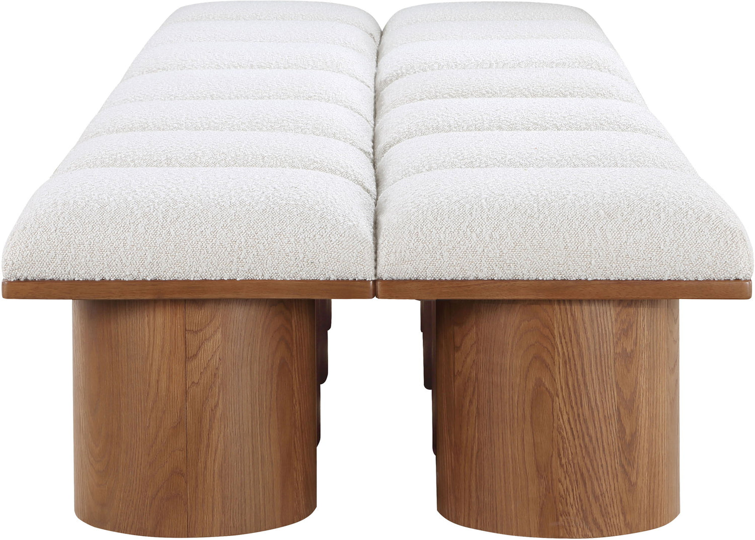 Bring valuable seating and remarkable style to your space with this Pavilion boucle fabric bench, an exquisite balance of style and usability for the entryway, bedroom, and beyond. Crafted from oak veneer with a walnut brown finish, this bench has a 4-inch-thick seat cushion that's channel-tufted for a touch of luxury. The bench's columnar bases add a dash of art deco design, making it a captivating focal point in any room.