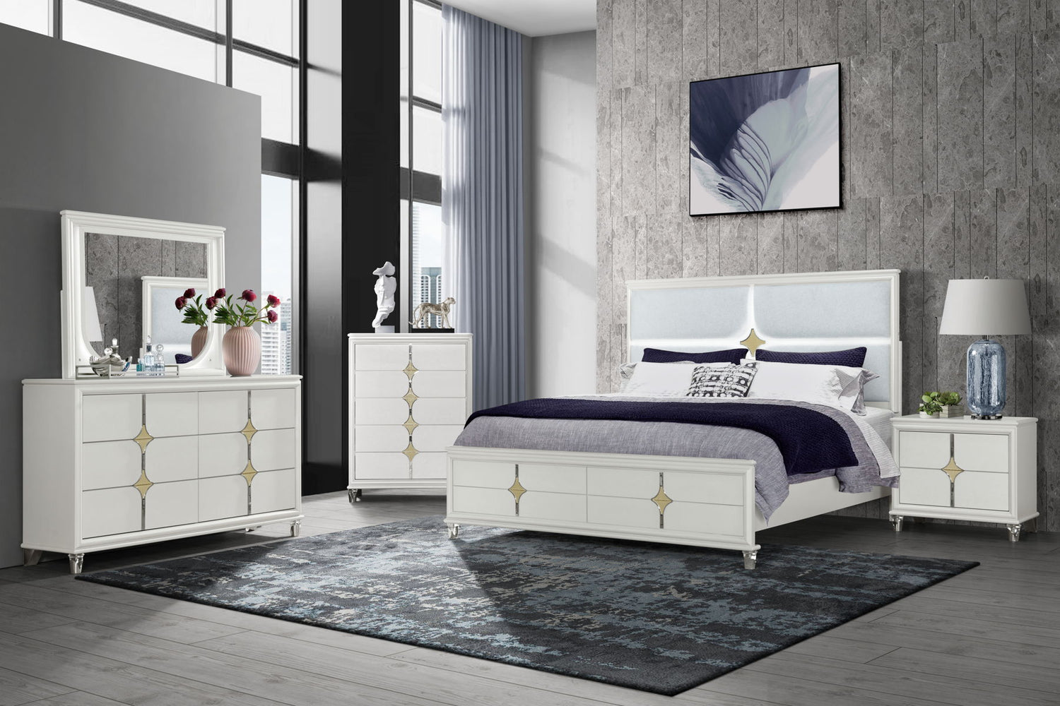 The Orion Dresser combines functionality with modern elegance. Its textured white drawer fronts and hidden drawer pulls create a seamless look, while the gold accents and acrylic legs add a touch of glamour. This dresser offers ample storage space, making it a stylish and practical addition to your bedroom.
