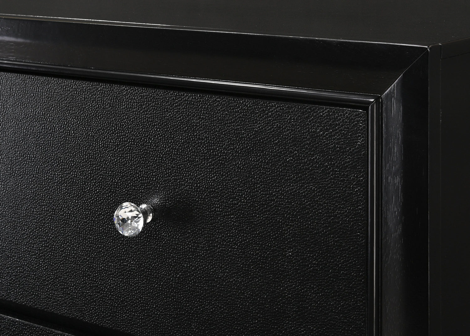 Step into a realm of sophistication and comfort with this stunning bedroom collection. Each piece showcases an exquisite blend of traditional charm and contemporary flair, making a bold statement with its textured surfaces and rich black finish. The bed, a centerpiece of luxury, features a sumptuous, tufted headboard with integrated lighting that invites a touch of opulence to your restful retreat. Coordinating storage solutions, including a dresser, chest, and nightstand, offer ample space with their gracefully designed drawers, accented with shimmering hardware that complements the set’s chic aesthetic.