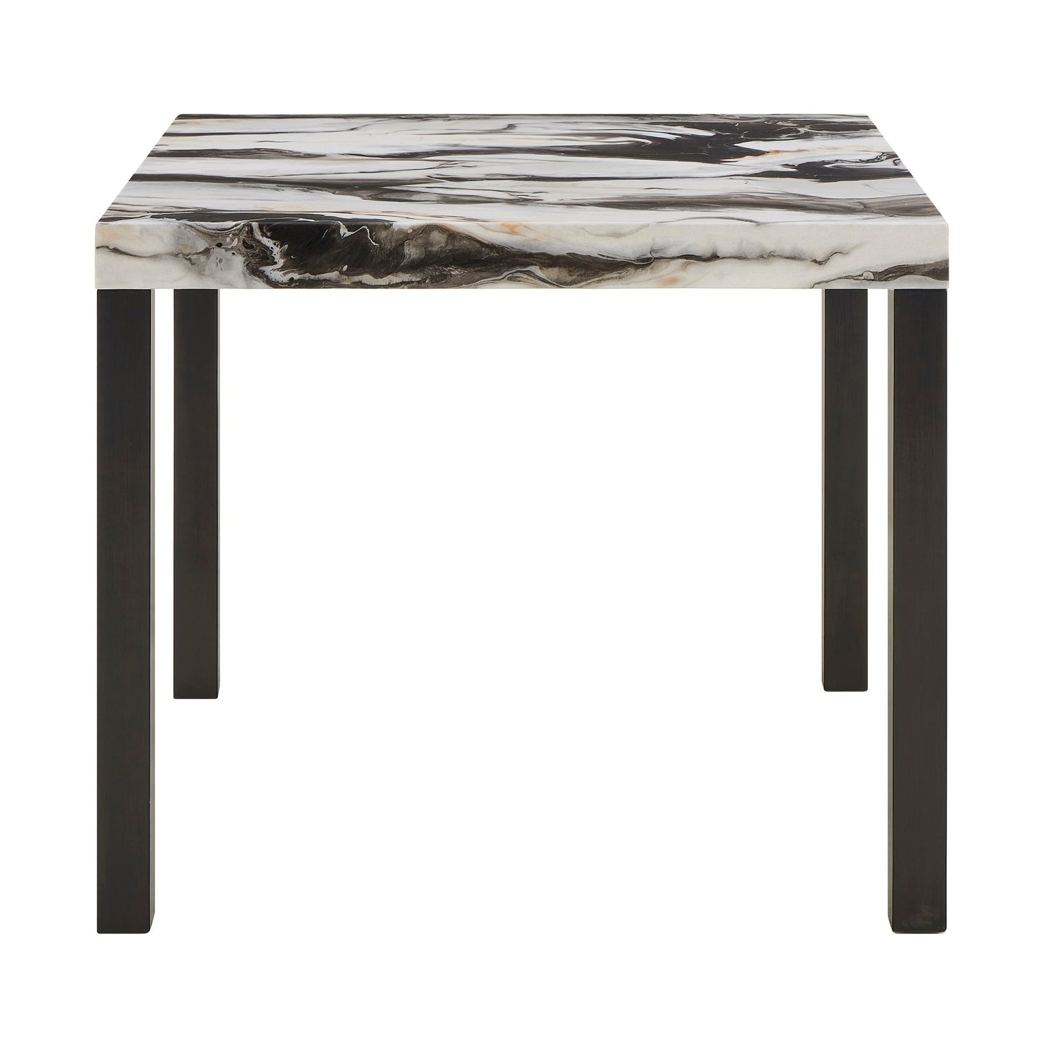 Contemporary and chic, this counter height dining group features a striking faux marble top that brings a polished, upscale feel to any dining area. The sleek, black-finished legs provide bold contrast and strong support, while the cushioned chairs are wrapped in smooth, mocha-toned upholstery for a warm and inviting look. Designed for both comfort and style, this set is ideal for casual dinners, morning coffee, or lively gatherings, offering a refined centerpiece that complements modern interiors with ease.