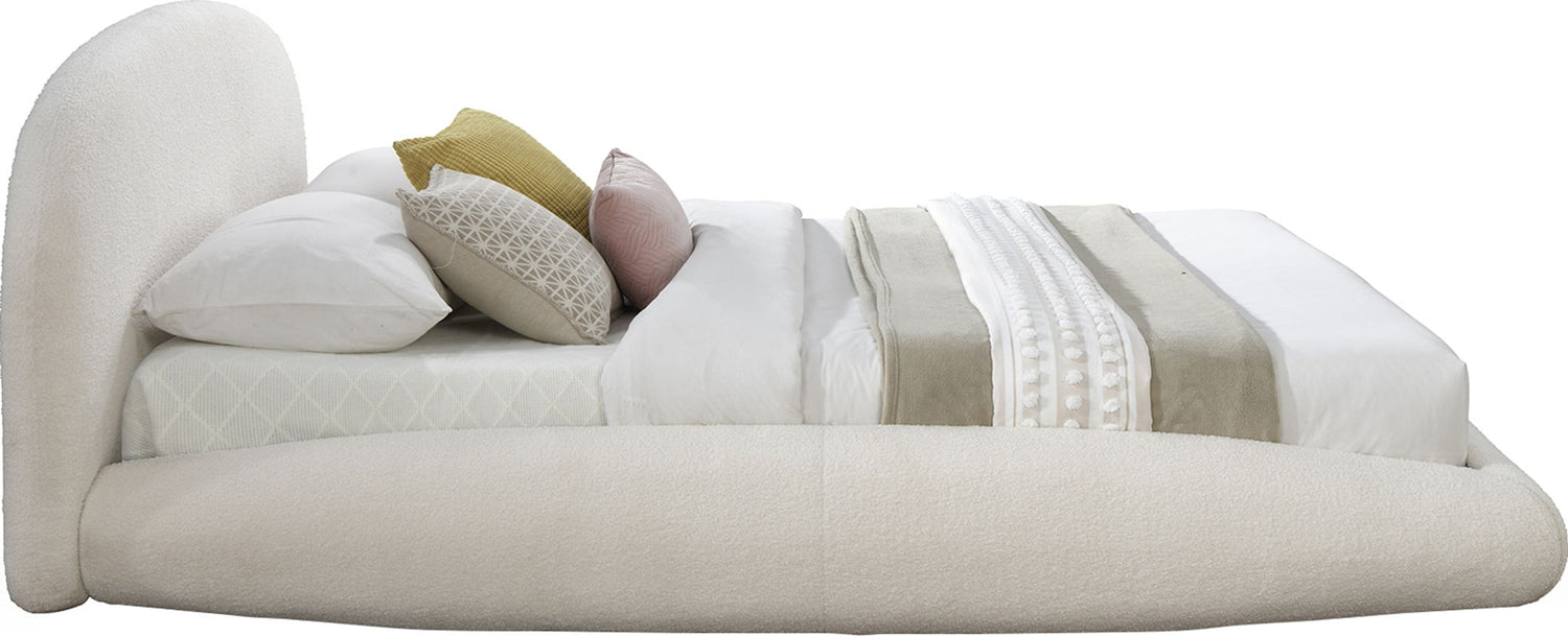 Refresh your bedroom with the Genesis tan faux shearling teddy fabric bed, upholstered in soft plush. The rounded headboard, rails, and footboard create the illusion of a floating bed, introducing a sleek contemporary touch to your space. Combining comfort and style seamlessly, this bed's luxurious fabric and innovative design make it a standout centerpiece. It's perfect for enhancing both the elegance and relaxation of your bedroom.