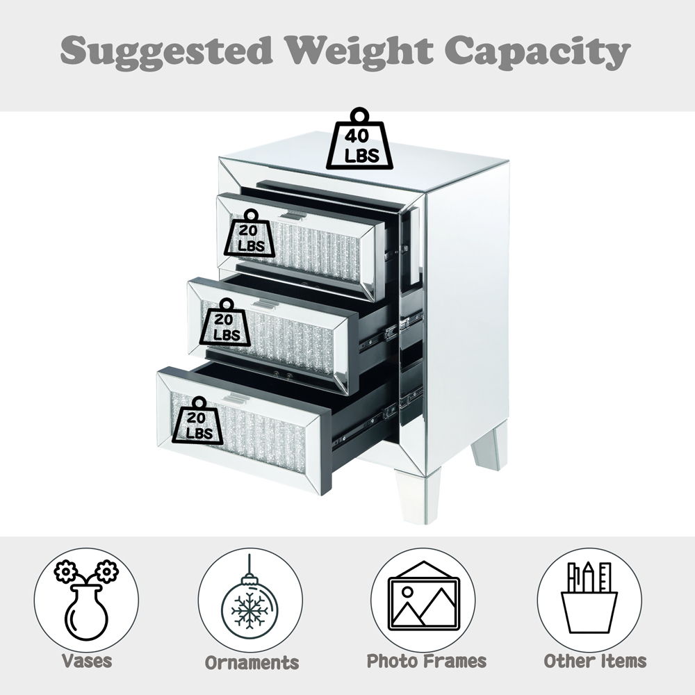 • Features: Mirrored Finish, Front Drawer w/Faux Diamonds & Clear Glass, Mirrored Tapered Leg