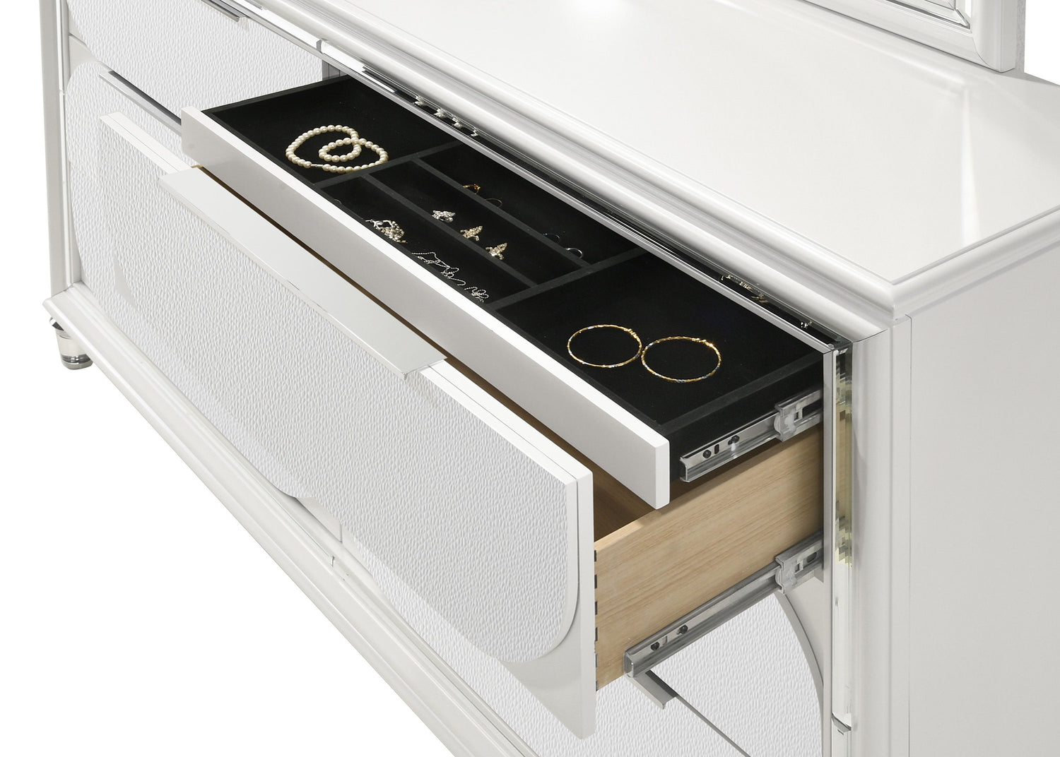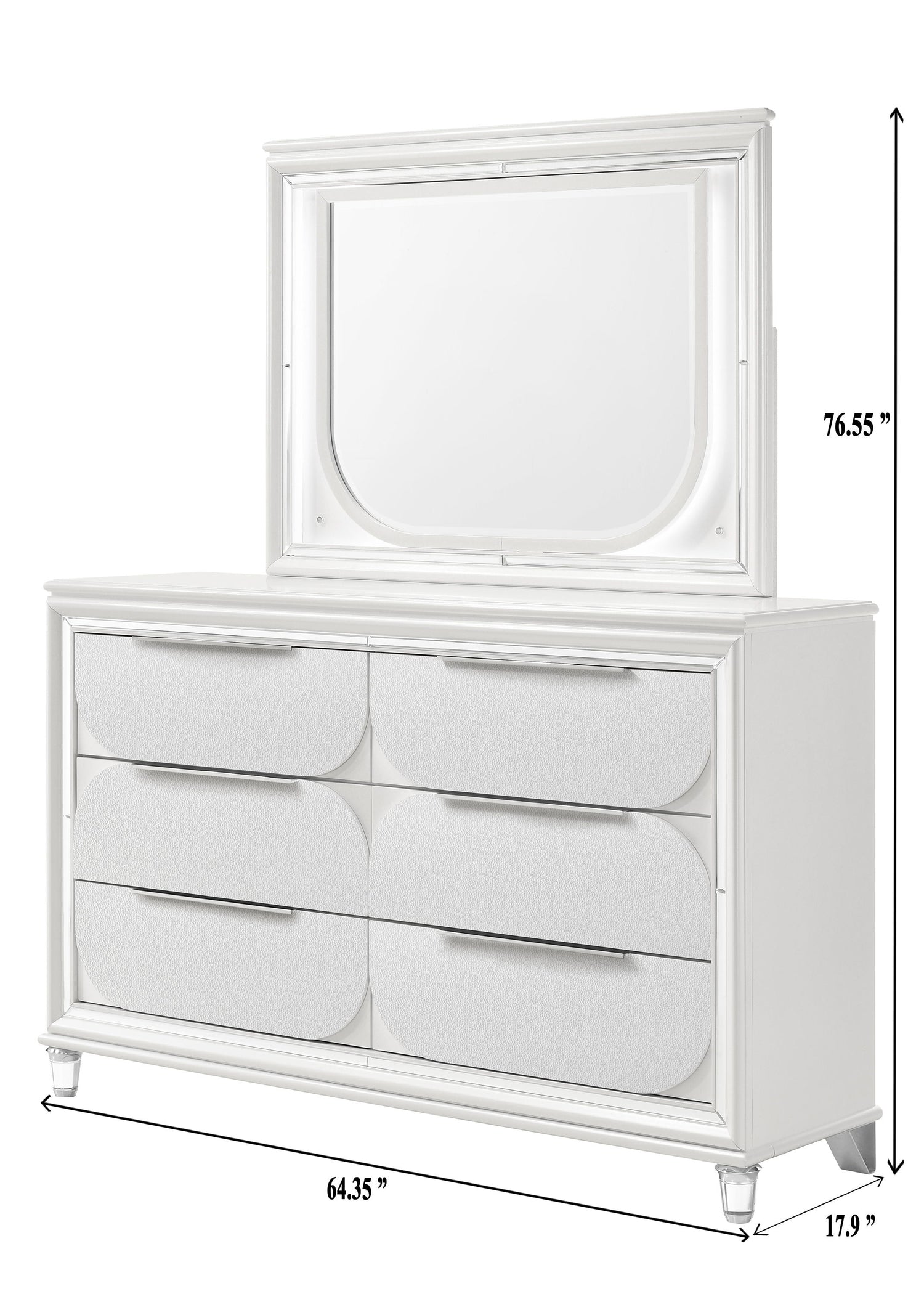 This bedroom set is a sophisticated fusion of modern design and luxurious comfort. Each piece boasts a bright finish, accented with sleek mirrored trim that adds a touch of shine and refinement. The centerpiece is an opulent bed with an oversized headboard, featuring plush upholstery and an elegant curve that invites relaxation. The accompanying pieces, including a nightstand, dresser, and chest, echo the bed's design with curved drawer fronts and chrome handles that provide a stylish contrast against the white. The set is designed to offer ample storage space while maintaining a chic, cohesive look.