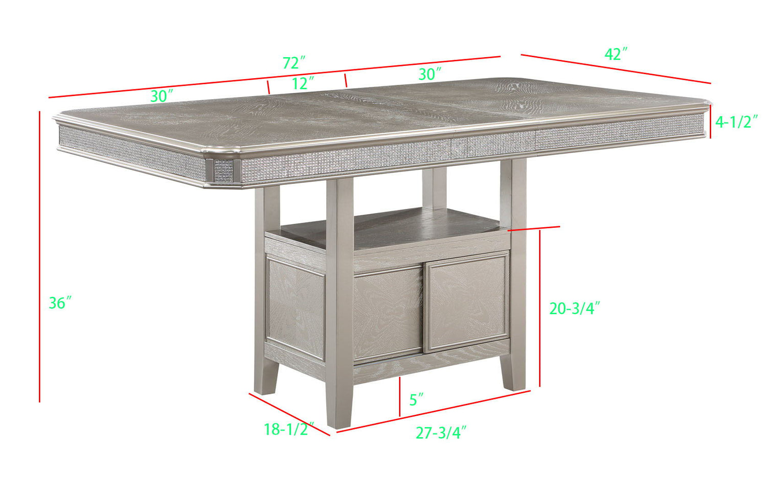 Add a touch of modern glamour to your dining space with this stunning counter-height dining group. Designed to impress, the sleek table features a shimmering metallic finish, intricate detailing, and a built-in storage base for added convenience. The matching chairs and bench are upholstered in luxurious, leather-like fabric with elegant channel tufting, providing both comfort and sophistication. Sparkling accents along the table edges and chair frames enhance the contemporary aesthetic, making this set a perfect centerpiece for stylish gatherings. Whether hosting a dinner party or enjoying everyday meals, this dining group brings elegance, functionality, and upscale charm to any home.