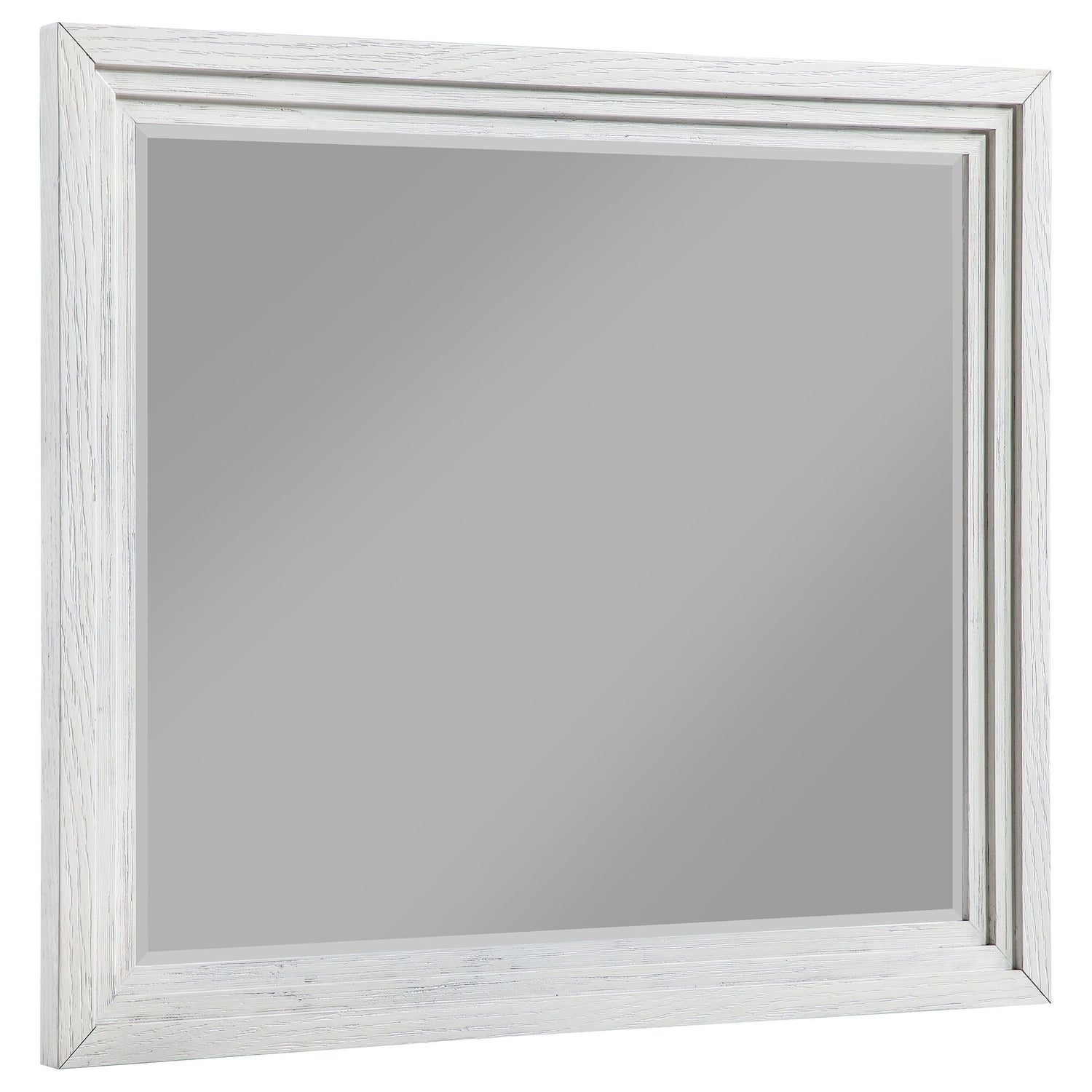 Augment a stylish bedroom setting with a transitional framed dresser mirror. It's the perfect complement to a relaxed bedroom ensemble, offering reflectivity and brightness while complementing decor. The mirror boasts a decorative frame and beveled glass, adding to its timeless character. The frame is crafted in wood with a tiered trim design that creates a stylish sense of depth. its distressed white finish is soothing and simple, complementing a variety of settings.